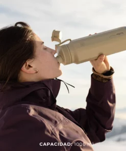 Su diseño elegante y el cálido color Mocha la hacen perfecta para cualquier ocasión. Con una capacidad de 1 litro, tendrás suficiente para mantenerte hidratado durante tus aventuras diarias. Además, incluye dos tapas intercambiables para adaptarse a tus necesidades: una para beber directamente y otra para un cierre hermético. Mide 28 cm x 8,4 cm y pesa solo 450 grs, ¡ideal para llevar a cualquier lugar!