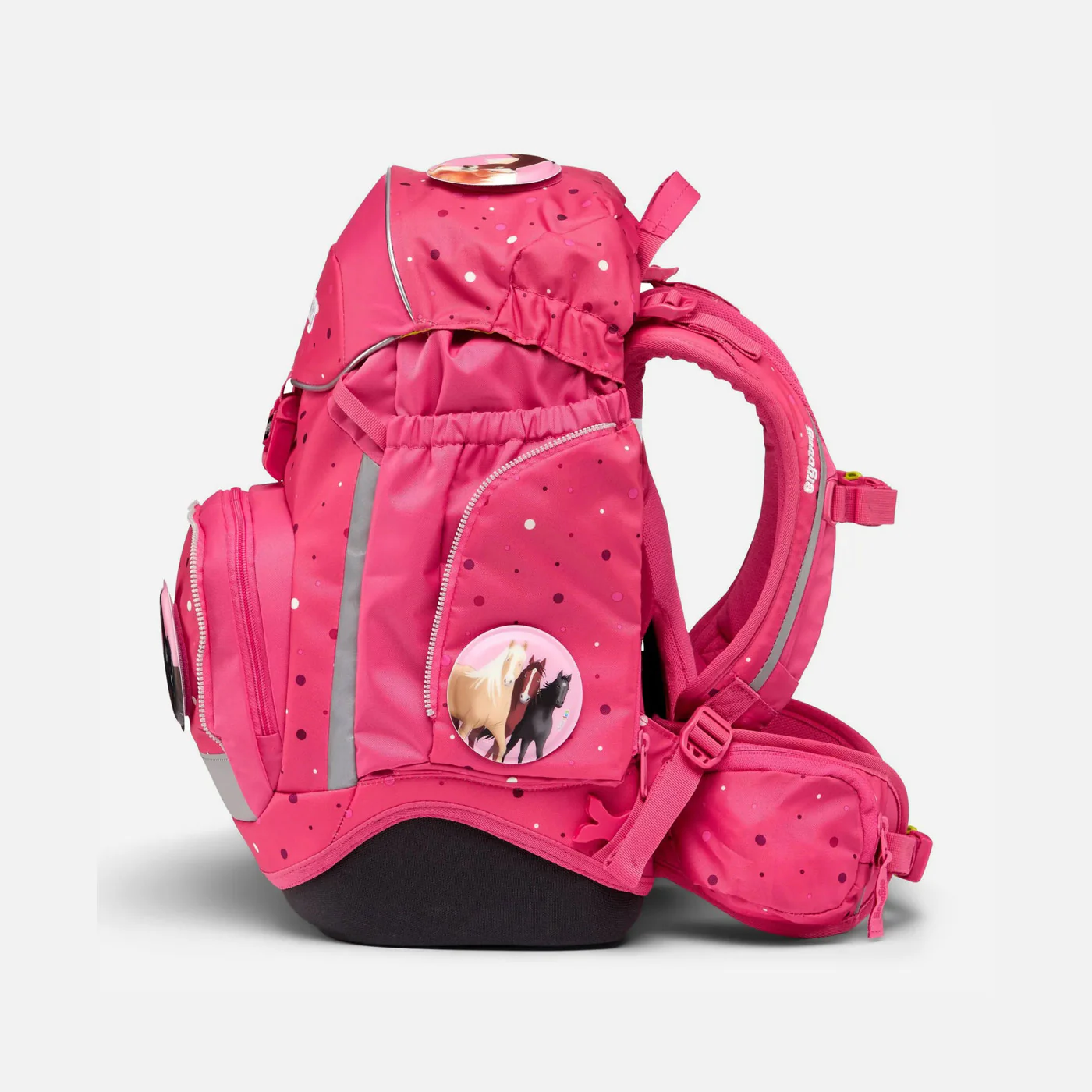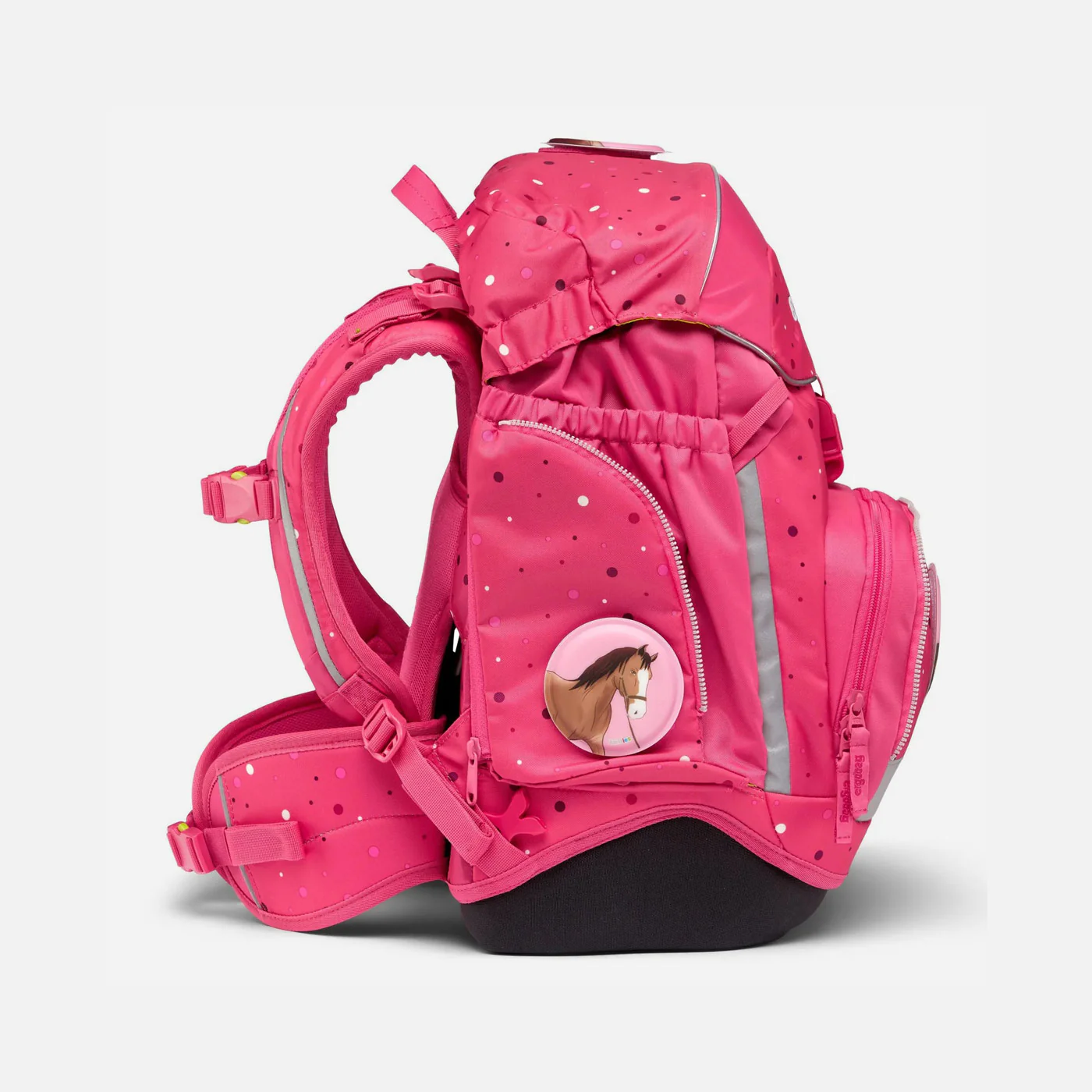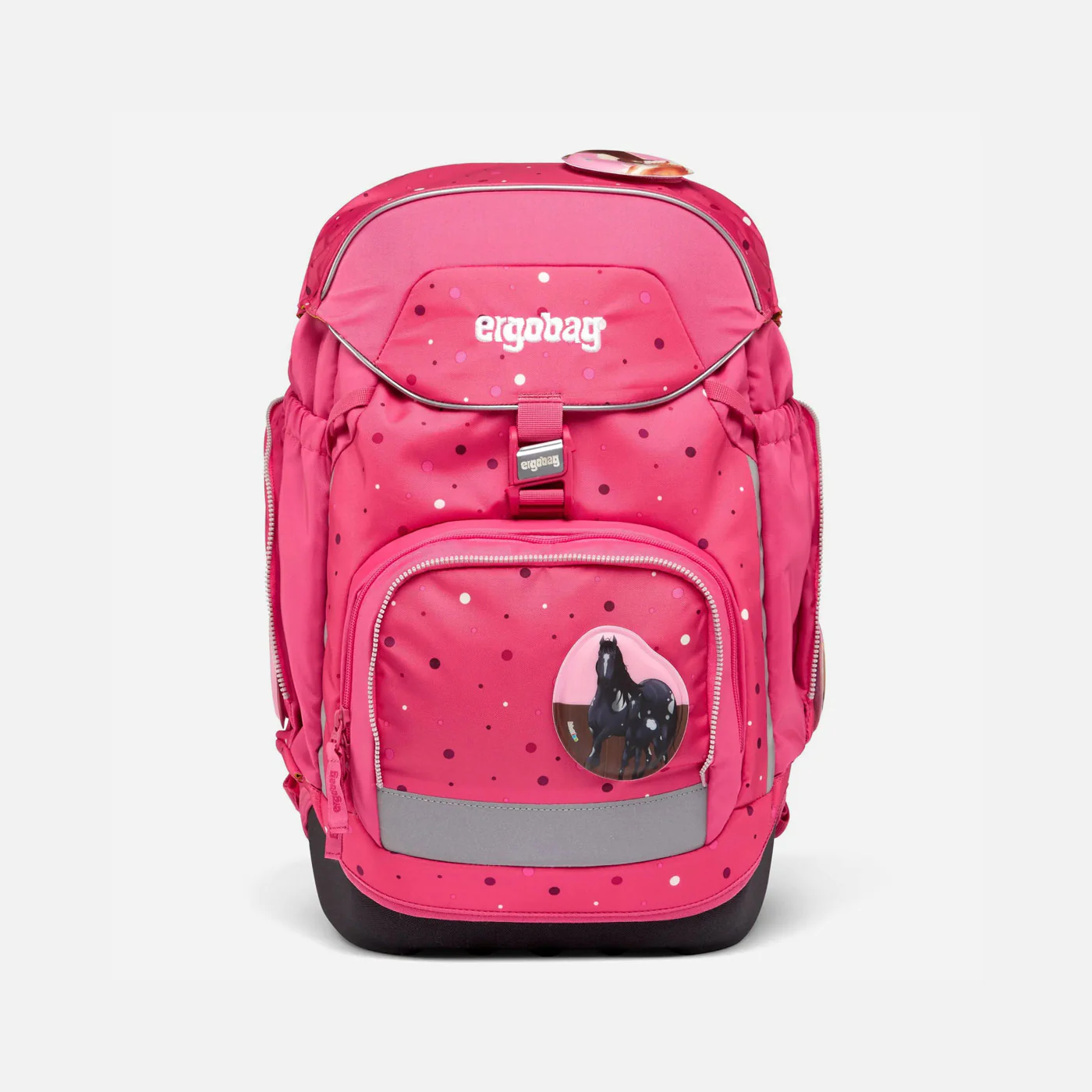 Además, la Ergobag Pack Horse DreamBear Pink cuenta con una visibilidad óptima gracias a los reflectores integrados en todo su contorno, lo que te protege de cualquier accidente en la vía pública. Los bolsillos laterales fijos y el loop para sujetar los Hangies te permiten organizar tus herramientas de manera eficiente y fácil de acceso.