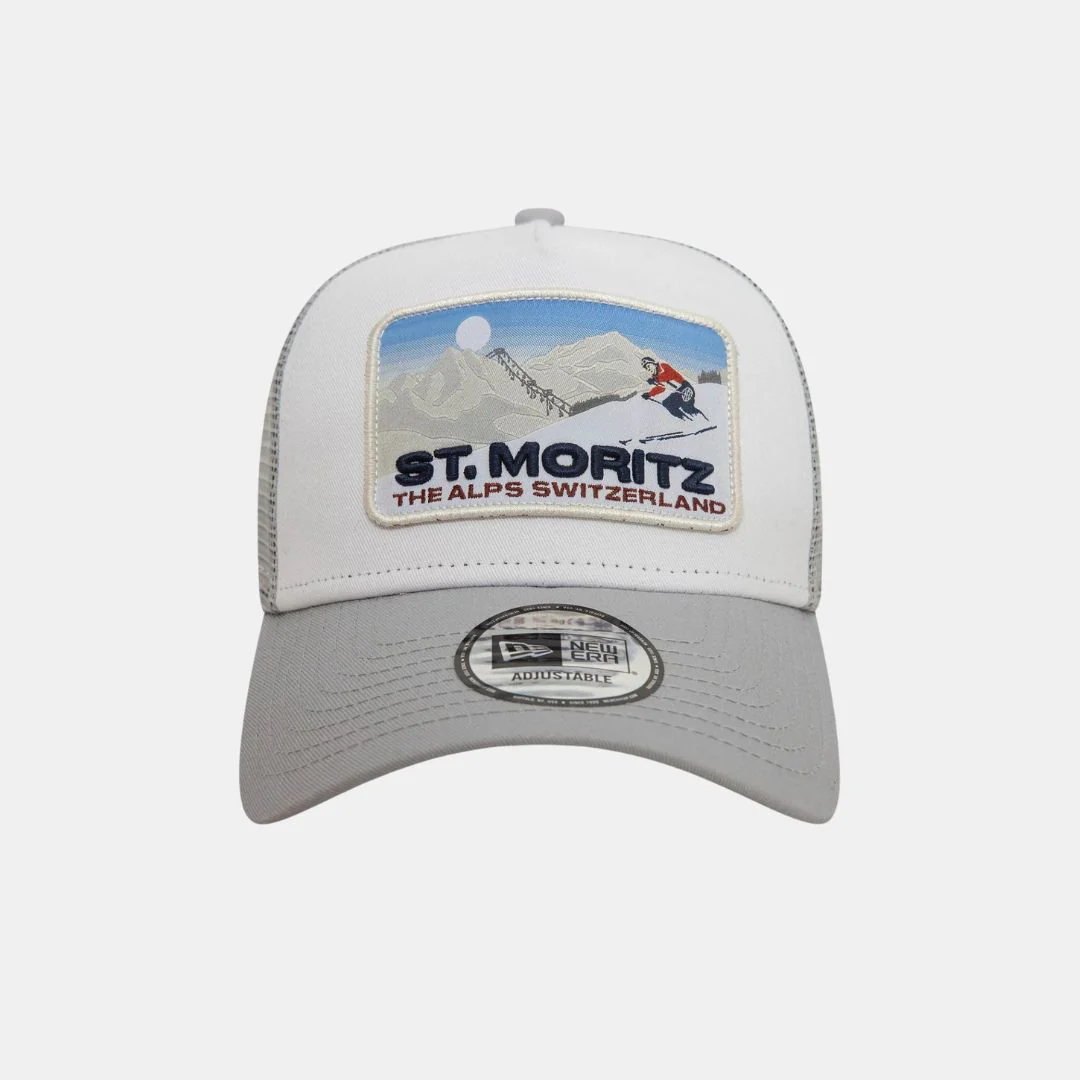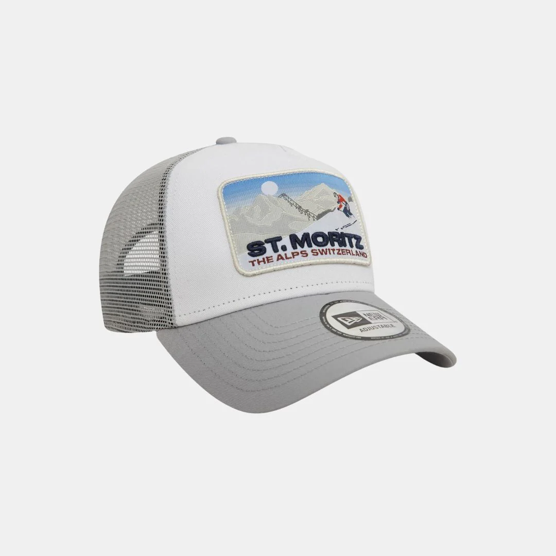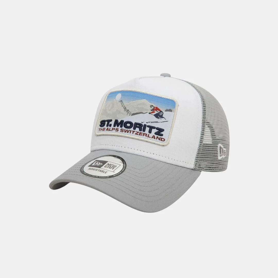 <strong>Palabras clave:</strong> Gorra, New Era, St. Moritz, esquí, snowboard, trucker, A-Frame, gris, gorra de invierno, gorra con parche, moda de montaña, ropa de esquí, accesorios de esquí, gorra transpirable, sostenible.